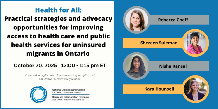 This webinar will include partners from the National Collaborating Centre for Determinants of Health, the Health Network for Uninsured Clients, and the Healthcare for All campaign (Decent Work and Health Network).